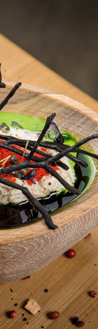 с горчичной икрой, пьяными огурцами и снегом из сливочного хрена