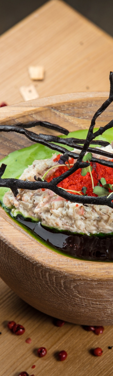 из цыпленка и брискета с мхом из бисквита, цукатами из шишек и хрустящий тостом